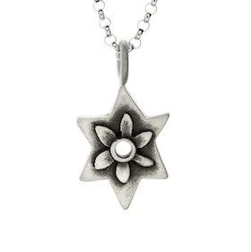 This sterling Star of David necklace departs from convention by featuring a flower at its center that cradles a set stone of your choice. Patina brings out the details of the design and helps make it a striking gift for a Bat Mitzvah or for any age. It hangs on a 16" fine gauge sterling rolo chain (optional longer chain length available through the drop-down menu below). Charm is 3/4". Handmade in the USA by Emily Rosenfeld.