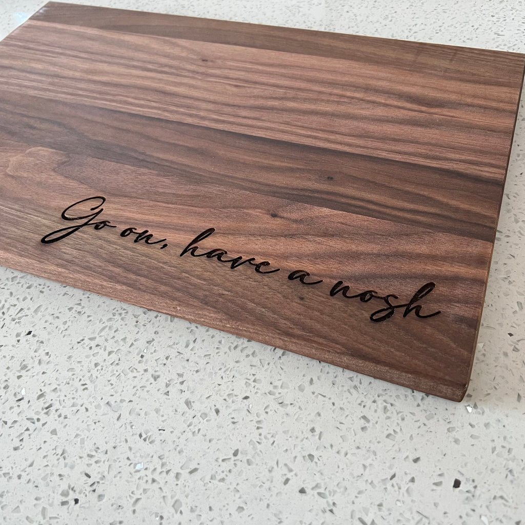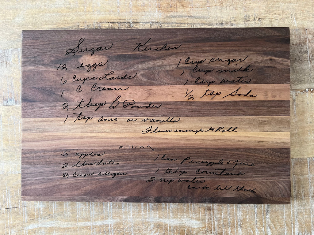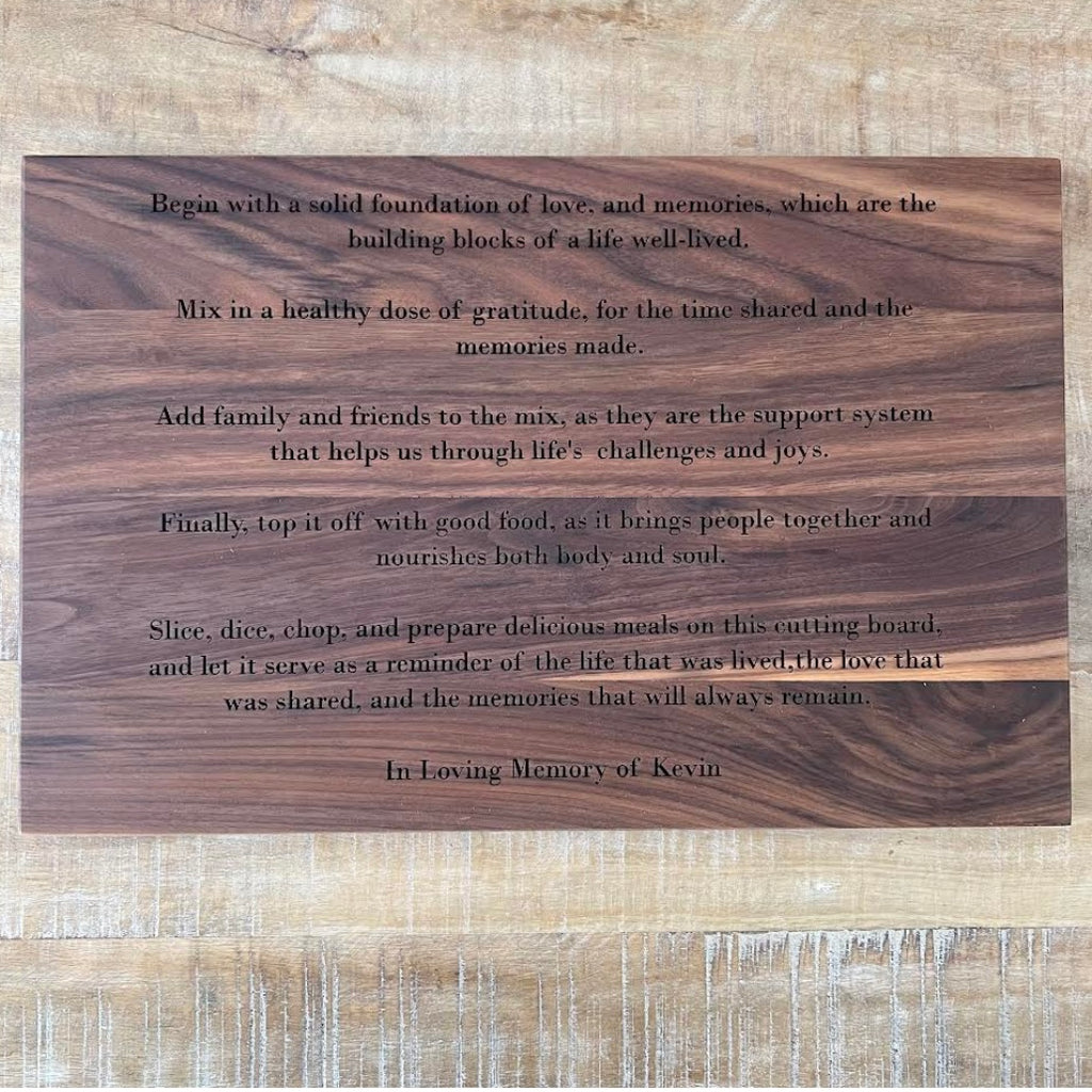 This unique walnut wood cutting board can be personalized with engraving of your choice. Showcase your family recipe, choose Shabbat Shalom or a custom message.