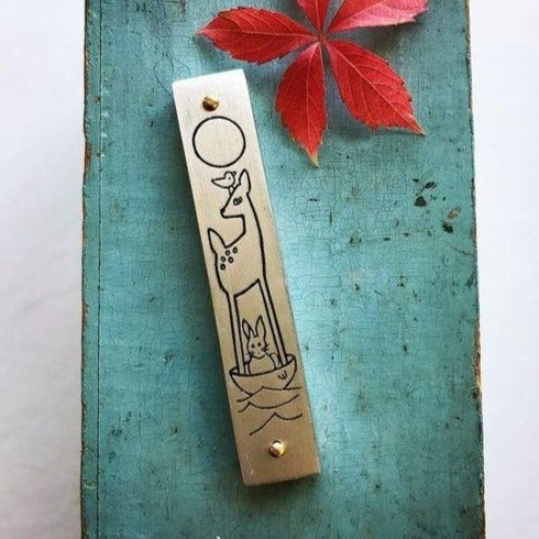 This line-drawn mezuzah has a modern, playful spirit. This Woodland Ark is a twist on the traditional Noah's Ark image. Here three woodland creatures are piled in a little boat, the Shin on its bow, sailing under a big peaceful moon. It makes a wonderful baby gift, or can be a beautiful blessing for your home.