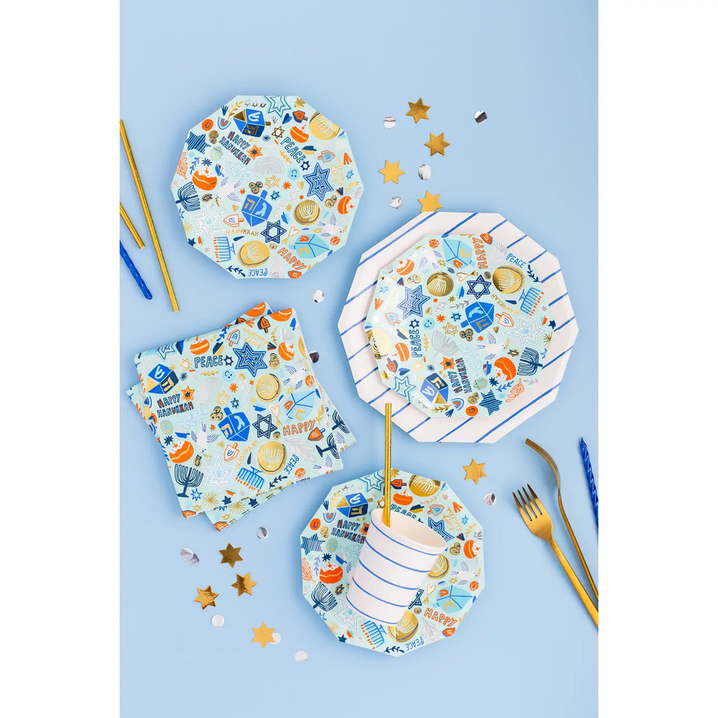 Featuring a festive color palette and a mix of gold and silver foil, these Hanukkah napkins are sure to shine bright for the festival of lights! Illustrated by Jordan Sondler