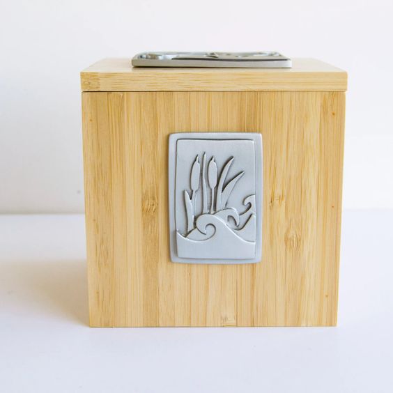 Made from sustainable bamboo, the box has typical striations and imperfections found in the material. The lid is removable and has a magnetic closure. It measures a 4.5” cube and comes with a description card. Handmade by Emily Rosenfeld.