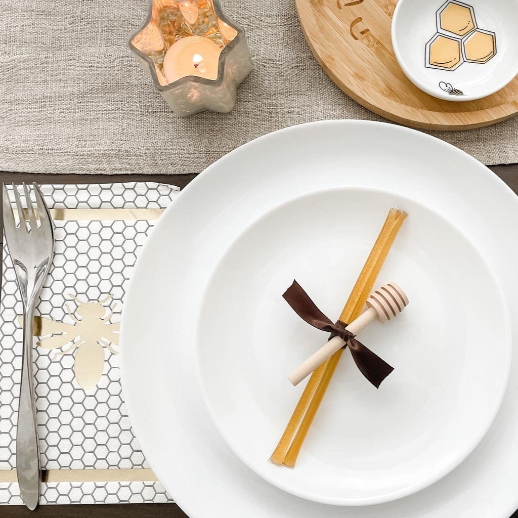 Set your table with these stylish, durable Rosh Hashanah honeybee 3 ply paper napkins. These black, white, and metallic gold foil beauties will add an inviting touch to your dinner table. Cocktail napkin also available.