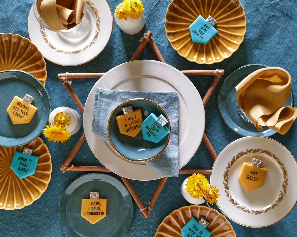 Celebrate Hanukkah with our marzipan dreidel conversation tiles scripted with fun expressions!  Sure to bring a smile to any and all Hanukkah meals, parties and celebrations!
