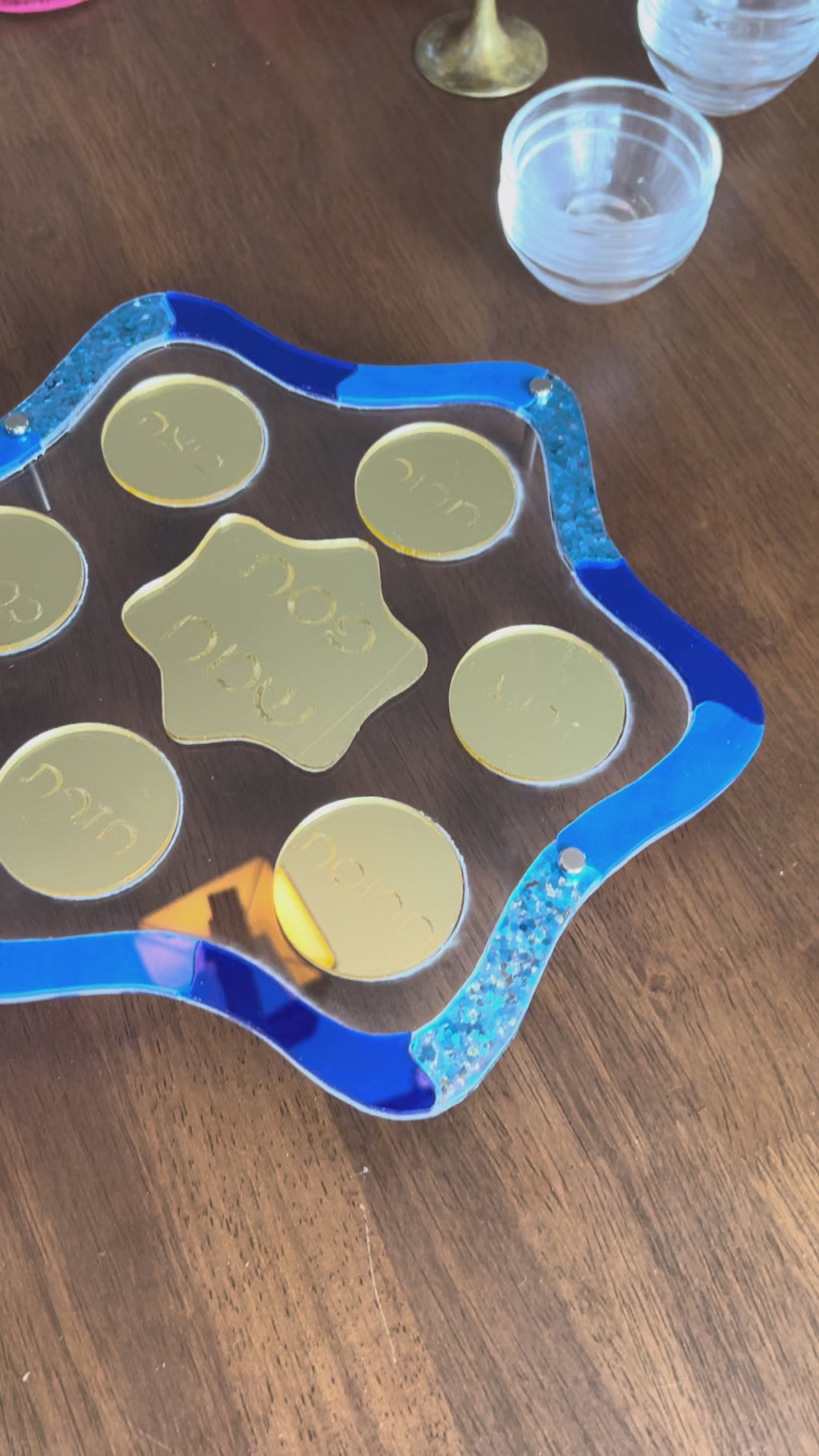 Designed as a true centerpiece, this layered acrylic plate combines mirror silver or mirror gold with shades of blue and clear acrylic to create a radiant and dimensional design. Raised on four silver legs, the plate sits elevated on your table, creating depth, shine, and visual presence for your Seder night.
