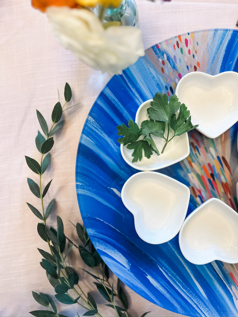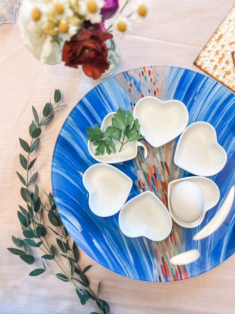 Size: 12" round glass seder plate paired with 6 delicate ceramic heart shaped bowls measuring approximately 3" x 3".