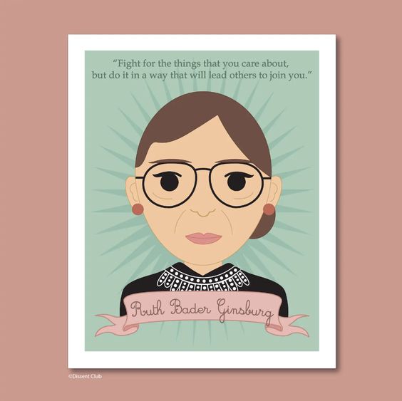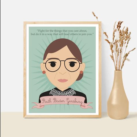 A beautiful, inspirational art print of Ruth Bader Ginsburg featuring the quote, "Fight for the things you care about, but do it in a way that will lead others to join you."